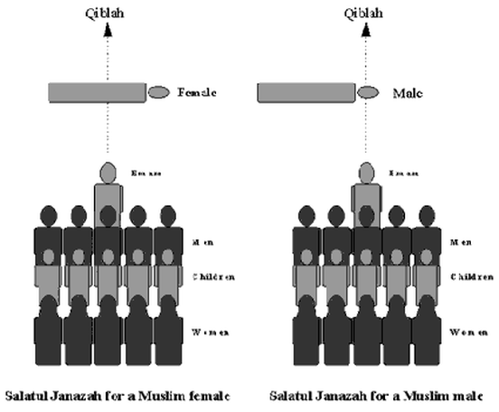 A divine service is held over the dead body of every Muslim, young or old, even of infants who have lived only a few minutes. When the soul leaves the body, preparations are made for bidding him the last farewell. It is highly recommended that, after washing and shrouding the body of the deceased, the body not to be kept long, but rather taken quickly, prayed for, and then buried. Salatul Janazah is required to be performed in congregation to request pardon and pray for the deceased. It is preferable that Salatul Janazah be performed outside the Mosque or the Musalla (Prayer room), like in the Mosque activity rooms or courtyards and may even be performed at the cemetery. Salatul Janazah is a collective obligation. A Muslim should not hesitate to participate in it, whether or not the deceased or his relatives are known to him. Salatul Janazah is said silently, except the Takbeer and Tassleem. All conditions for regular Salat are required in Salatul Janazah such as Tahara, Wudu, clean body and clothes, neeyah (intention), and facing the Qiblah. There are specific times when it is prohibited to perform Salatul Janazah, unless it becomes necessary, due to the condition of the body, to perform it quickly and then bury the body.