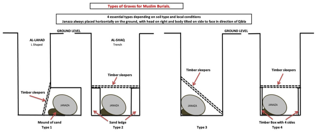 It is important to observe workplace health and safety rules both for the family, friends and funeral directors. It is prohibited to step over, lean, or sit on any grave. It is prohibited to build any form of construction on the grave, or decorate the grave. From the authentic traditions, it is clear that to erect domes over graves or build mausoleums or Mosques on graves is strictly forbidden. Prophet Muhammad (PBUH) said: ” Do not build Mosques in the graveyard ” (Muslim). It is prohibited to plaster the grave, whitewash the grave, or use cooked stones. It is prohibited to pray facing towards the graves. Abu Martad al-Ghanawi reported that Prophet Muhammad (PBUH) said: ” Do not pray facing towards the graves ” ( Muslim). Women are generally discouraged from attending the burial. This is according to the authentic Hadith of Um-Atiyah who reported that we were forbidden to accompany funeral processions. (Bukhari & Muslim). It is prohibited to cremate the body of dead Muslim, even if the deceased requested it before his death. Performing autopsy on a dead Muslim is totally prohibited, unless it is requested by court order or for medico-legal reasons. The types of graves vary depending on the soil type. There are 4 basic types and QIFS uses the forth option.