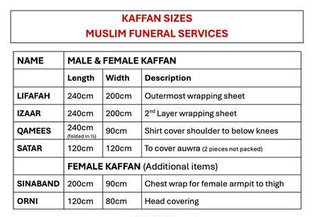 Shrouding should start immediately after washing the body of the deceased. It is recommended to use white sheets from inexpensive material. Extravagance is not recommended in the Kafan (Shroud). All measurements may vary depending on the stature of the deceased. The material of the sheet should not have any stitching, not be silk, nor should any gold be used. Our QIFS Facility has pre-cut and packed male and female adult kaffans. These are placed and folded in the order of use and so when the pack is opened and unfolded it is already ready to be used in the correct order. We also have a roll of fabric available should you need to cut a specific size.